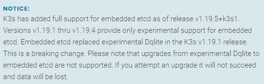 (2021년 2월 21일 추가 ) k3s v1.19.5+k3s1 버젼부터는 embedded etcd를 정식 지원하도록 변경되었다. 그러므로 Dqlite를 사용하는 경우 업그레이드에 문제가 있을 수 있다.