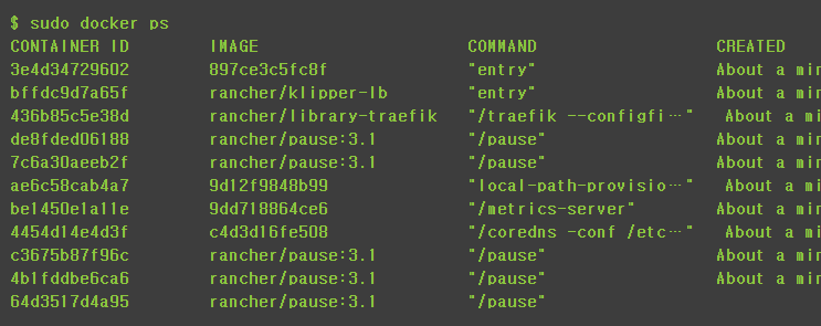 • 이 작업 이후 docker ps -a 명령을 쓰면, kubernetes 관련된 많은 container들이 떠 있는것을 확인할 수 있다.