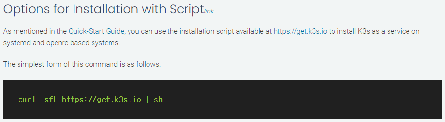 curl -sfL https://get.k3s.io | sh -- 단, 한줄로 무언가를 할 수 있다는 말은, 기본적인 것은 알아서 다 설치해 줄께~ 정도의 말이 될 것이다.