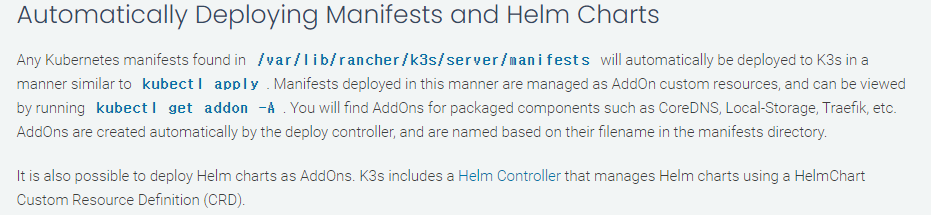 - 단순하다, k3s를 설치할때, 특정 디렉토리에 yaml 파일들을 두게 되어 있는데, 거기 있는것들이 자동으로 설치 되는 것이다.