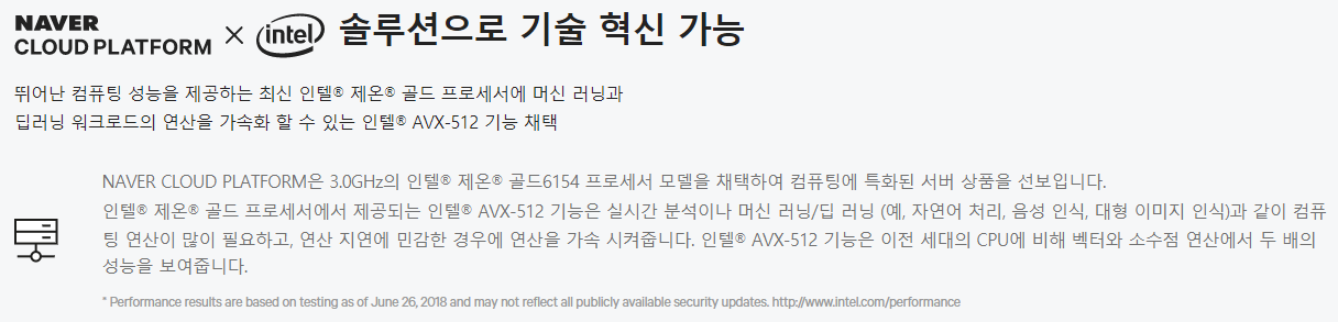 - 네이버클라우드에서도 AVX512를 지원하는 CPU를 사용한다고 광고 ( 물론, Intel이랑 협약을 맺었으니 광고하는거겠지? ㅎ )