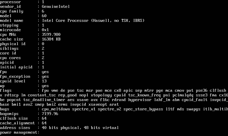 Haswell, no TSX, IBRS를 사용하고 있으며, 속도는3.6Ghz, 캐시는16MByte이다. - flag 쪽을 봐도