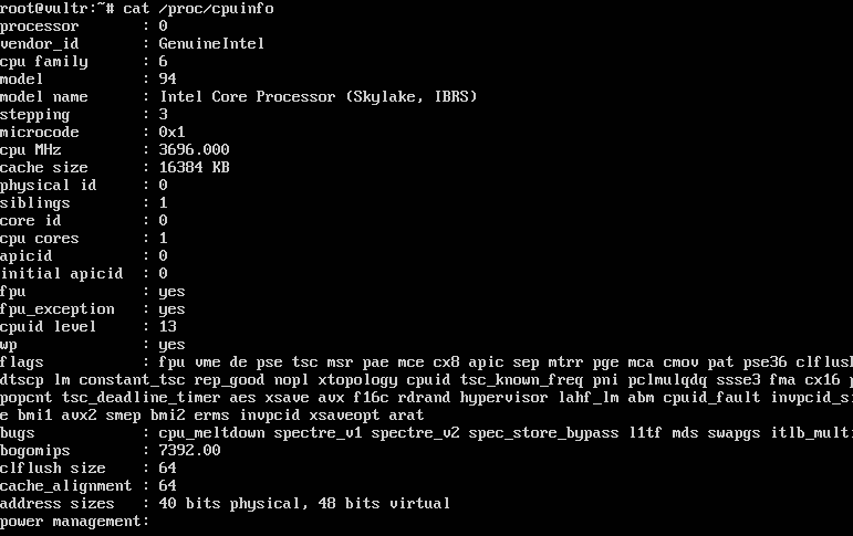 Skylake, IBRS를 사용하고 있으며, 속도는3.7Ghz, 캐시는16Mbyte이다. - flag 쪽을 봐도