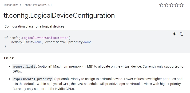 tf.config.LogicalDeviceConfiguration의 설정으로 MB 단위로 설정가능 하다. (현재는 GPU 일때만 지원) - 관련링크 : https://www.tensorflow.org/api_docs/python/tf/config/LogicalDeviceConfiguration