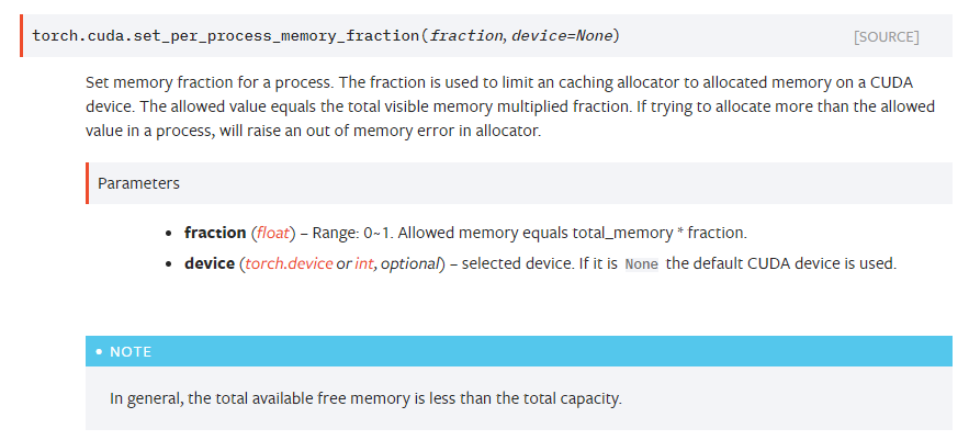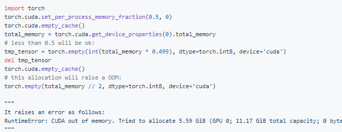 - 그리고 2020년 11월 18일, Pull Request를 통해서 코드가 제출 되었고, 2021년 3월 4일 PyTorch 1.8 이 릴리즈되면서 해당 기능이 추가 되었다. ( torch.cuda.set_per_process_memory_fraction )