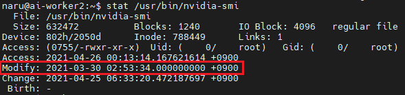 stat /usr/bin/nvidia-smi명령을 통해 nvidia-smi 명령의 파일 상태를 확인해 보았다.