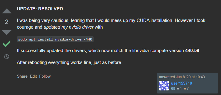 - 아니면 apt update를 통해서 nvidia-driver를 업데이트 해 보라는 둥...